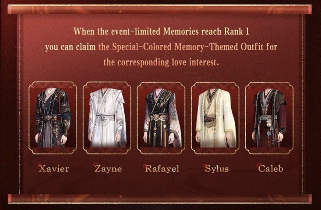 When an event limited Memory reaches Rank 1, players unlock a Special Colored Memory themed outfit for the corresponding love interest. This reward is exclusive to the event and cannot be obtained later.