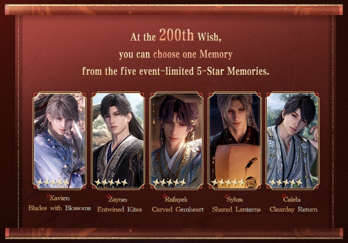 A limited time Memory Growth Bonus runs alongside the wish event. By completing growth tasks for event limited 5 Star Memories, players can earn upgrade and ascension materials.